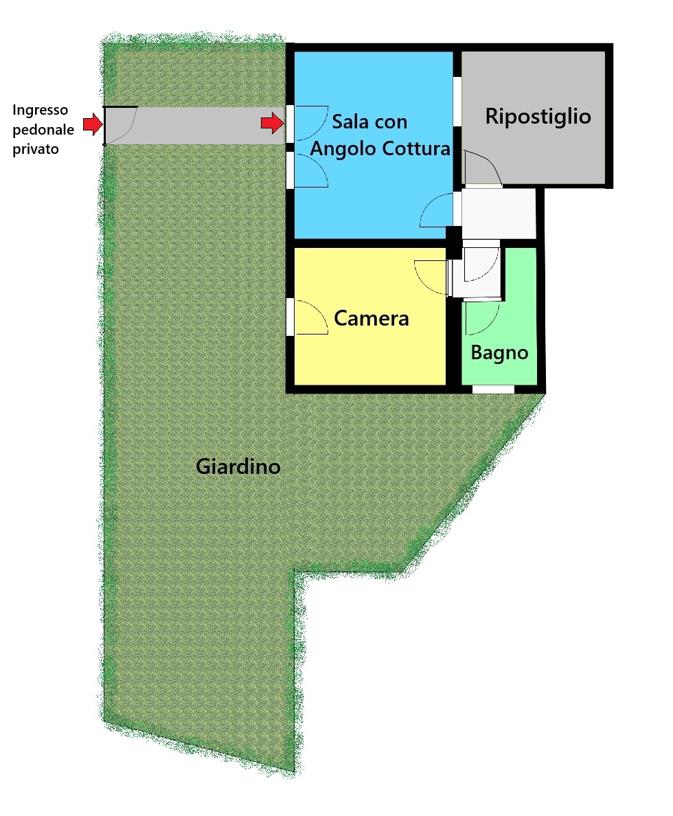 L’immobile è cosi composto: Ingresso su soggiorno con angolo cottura di cc mq. 24,00, disimpegno notte di cc. 4,65 con armadio a muro, ampio ripostiglio con finestra che dà sulla zona giorno di cc. mq 17,00, camera matrimoniale di cc. mq.16,00 con accesso diretto al giardino e bagno con doccia di cc. mq. 8,78.