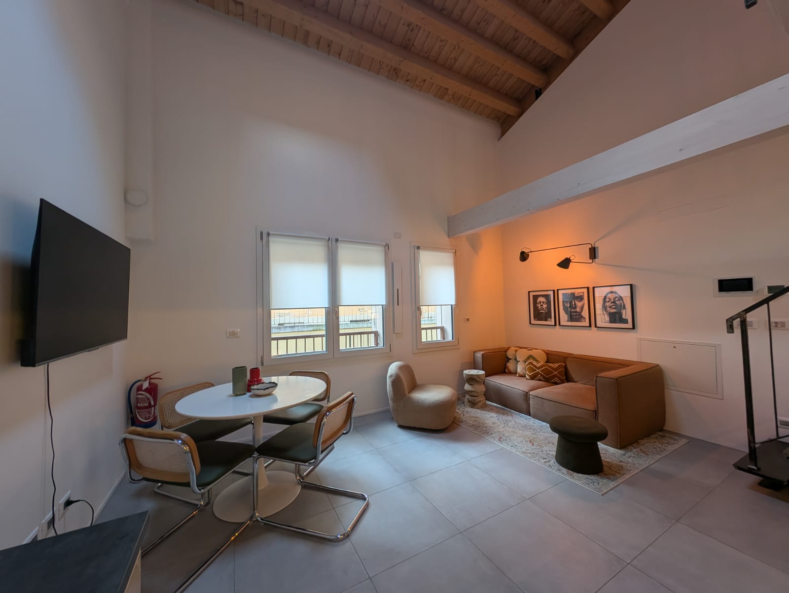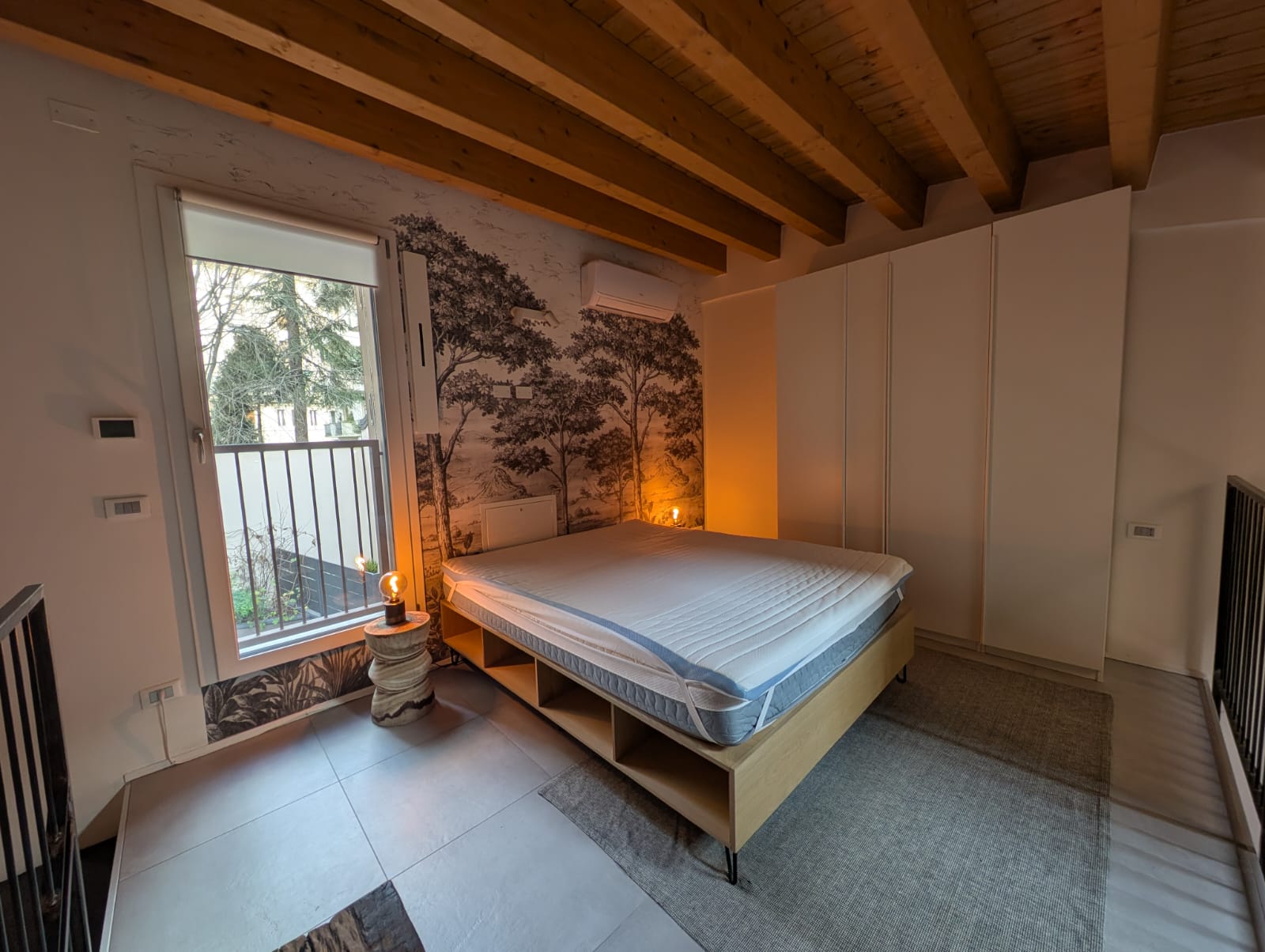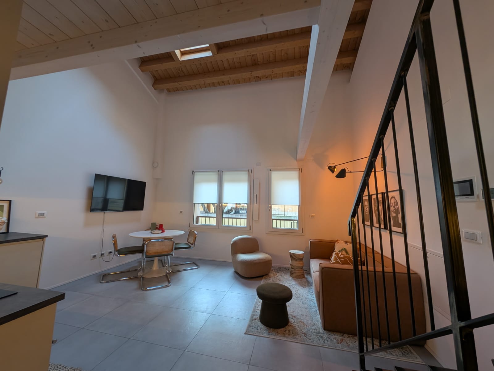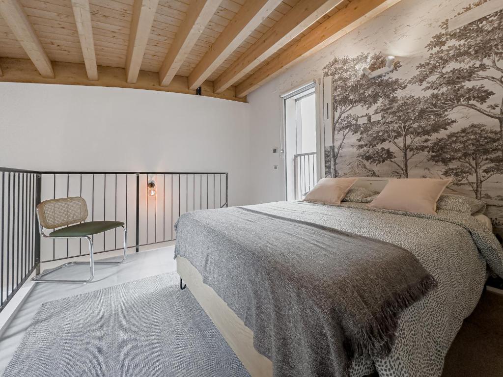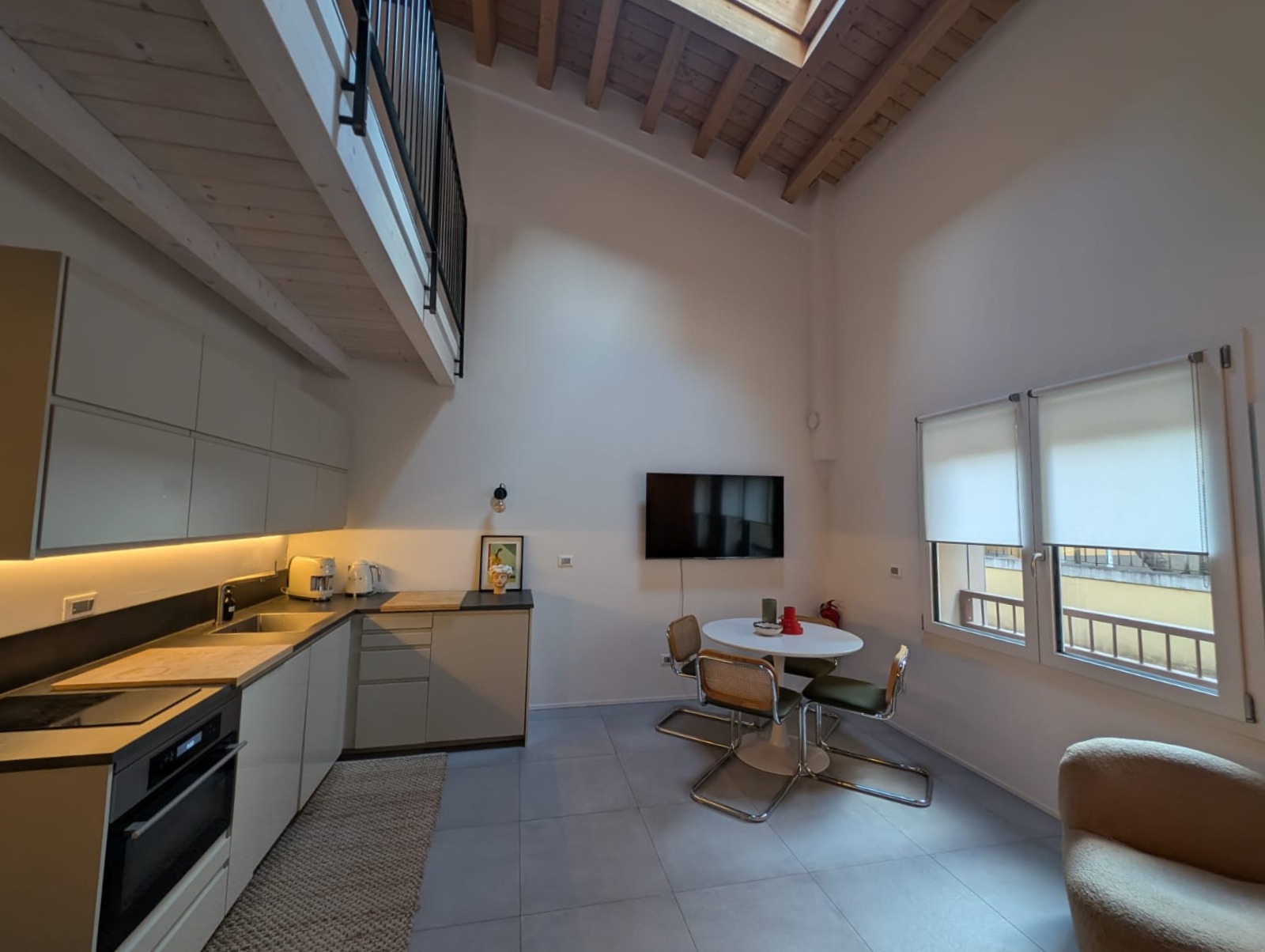 Al primo piano, la camera soppalcata si affaccia sul soggiorno sottostante, creando un raffinato gioco di volumi e una piacevole continuità visiva tra i due livelli.