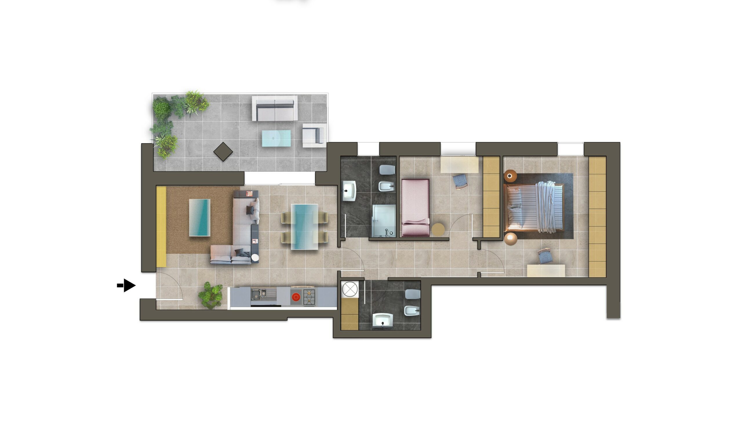 L’appartamento 5, un trilocale al primo piano con ampia loggia, offre spazi confortevoli e ben distribuiti: soggiorno con angolo cottura affacciato sull’esterno, due camere da letto e due bagni.