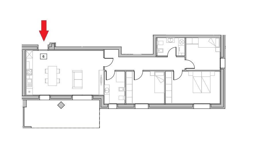 L’appartamento 6, un quadrilocale al primo piano con ampia loggia, offre spazi generosi e ben distribuiti: soggiorno con angolo cottura affacciato sull’esterno, tre camere da letto e due bagni.
