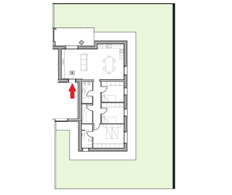 L’appartamento 16, un pentalocale al piano terra con giardino privato di circa 400 metri quadrati, rappresenta una soluzione unica per chi cerca ampi spazi esterni da vivere in totale privacy.