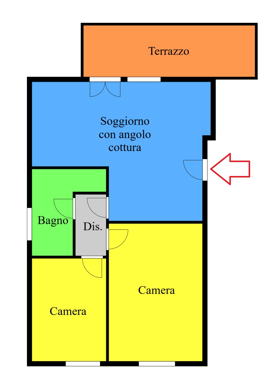 L’immobile è cosi composto: Ingresso su ampio soggiorno con angolo cottura di cc. 26 mq, dalla zona giorno si accede alla terrazza di cc. 12 mq., disimpegno notte, bagno con doccia, camera matrimoniale di cc. 16 mq e camera singola di cc. 9,00 mq. Soppalco di cc 40 mq. adibito a studio / camera