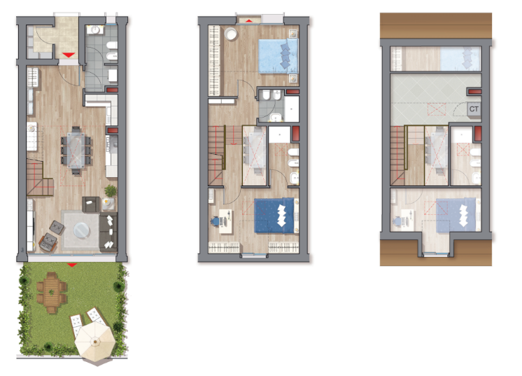 [U04] Questa soluzione si sviluppa su tre livelli fuori terra. Il pian terreno è dedicato per intero alla zona giorno: ampio open-space di 40 mq con cucina a vista ed accesso al giardino privato. A servizio del piano troviamo un bagno, una lavanderia ed un deposito/ripostiglio. Al primo piano troviamo due ampie camere matrimoniali, di cui la padronale con bagno pertinenziale, ed un ulteriore servizio. Al piano superiore troviamo un ambiente mansardato illuminato da velux con altezze spioventi dai 2 ai 1,3 metri, volendo utilizzabile come piccolo studio o cameretta.