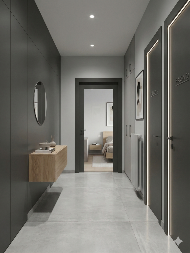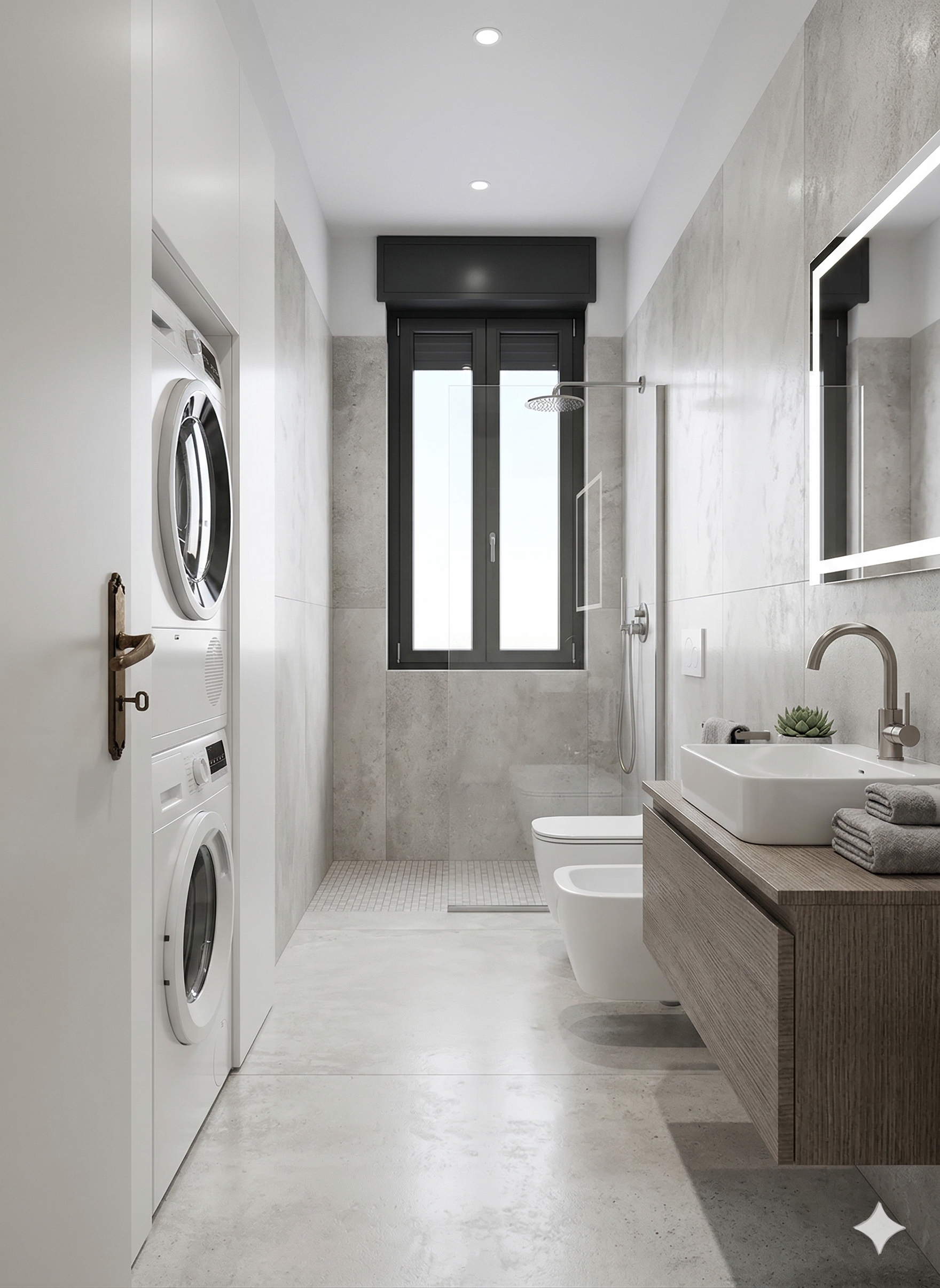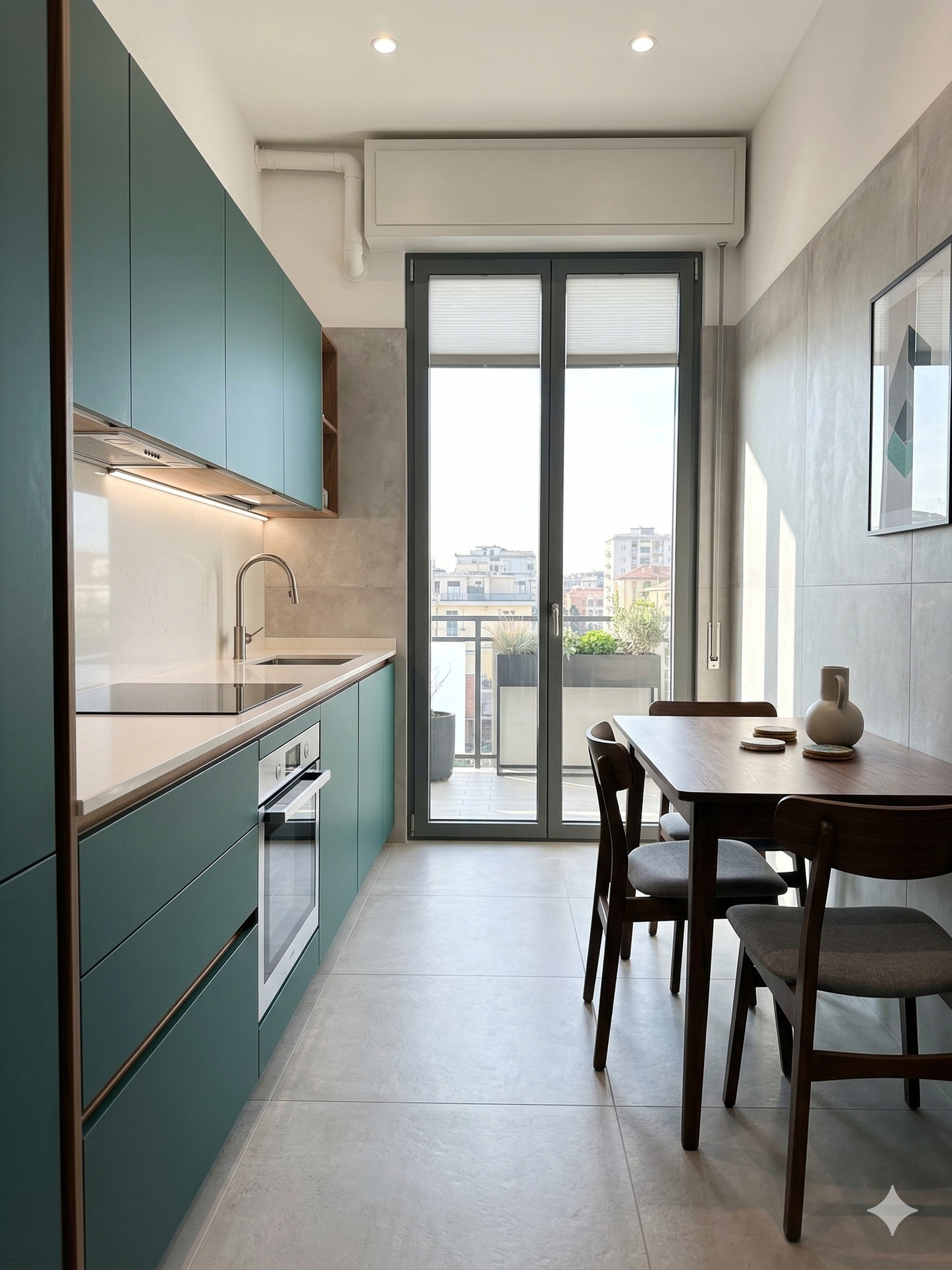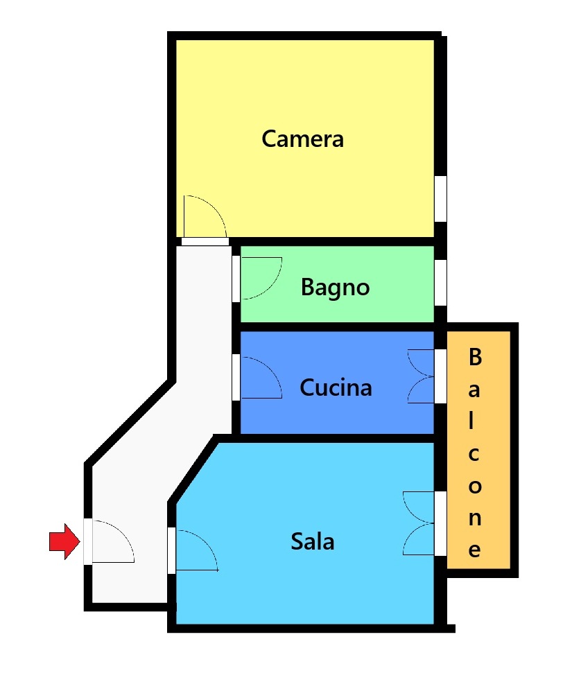 Vi sono, inoltre, due diverse alternative per la distribuzione degli spazi: realizzare un grande bilocale, unendo la cucina al soggiorno, oppure una zona giorno unica, ossia la cucina e le due camere da letto (soluzione ideale per locarlo a studenti).