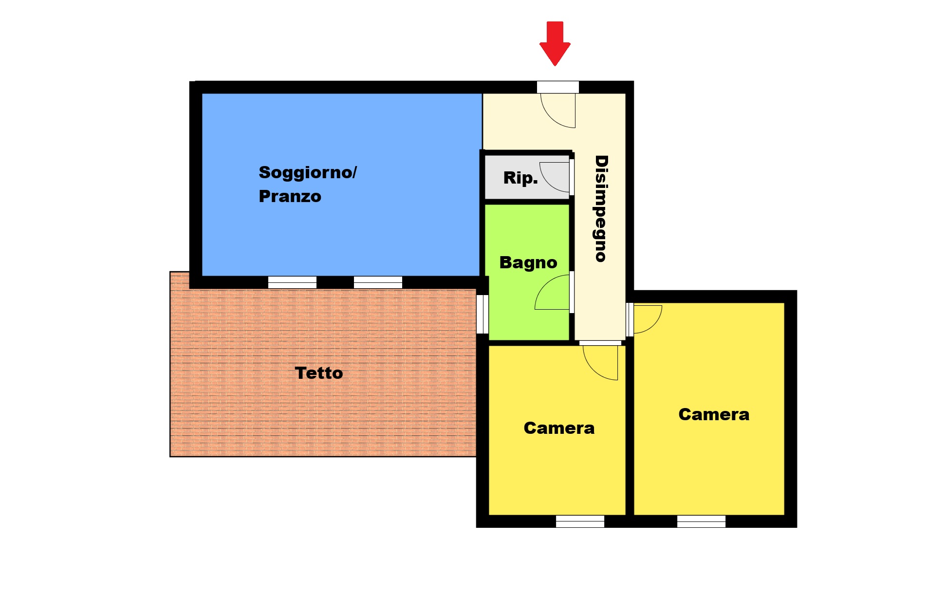 L’immobile si apre su un comodo ingresso che conduce a un ampio e luminoso soggiorno con cucina a vista, ideale per vivere la zona giorno in modo funzionale e conviviale. La zona notte è composta da due spaziose camere da letto matrimoniali e un bagno finestrato.