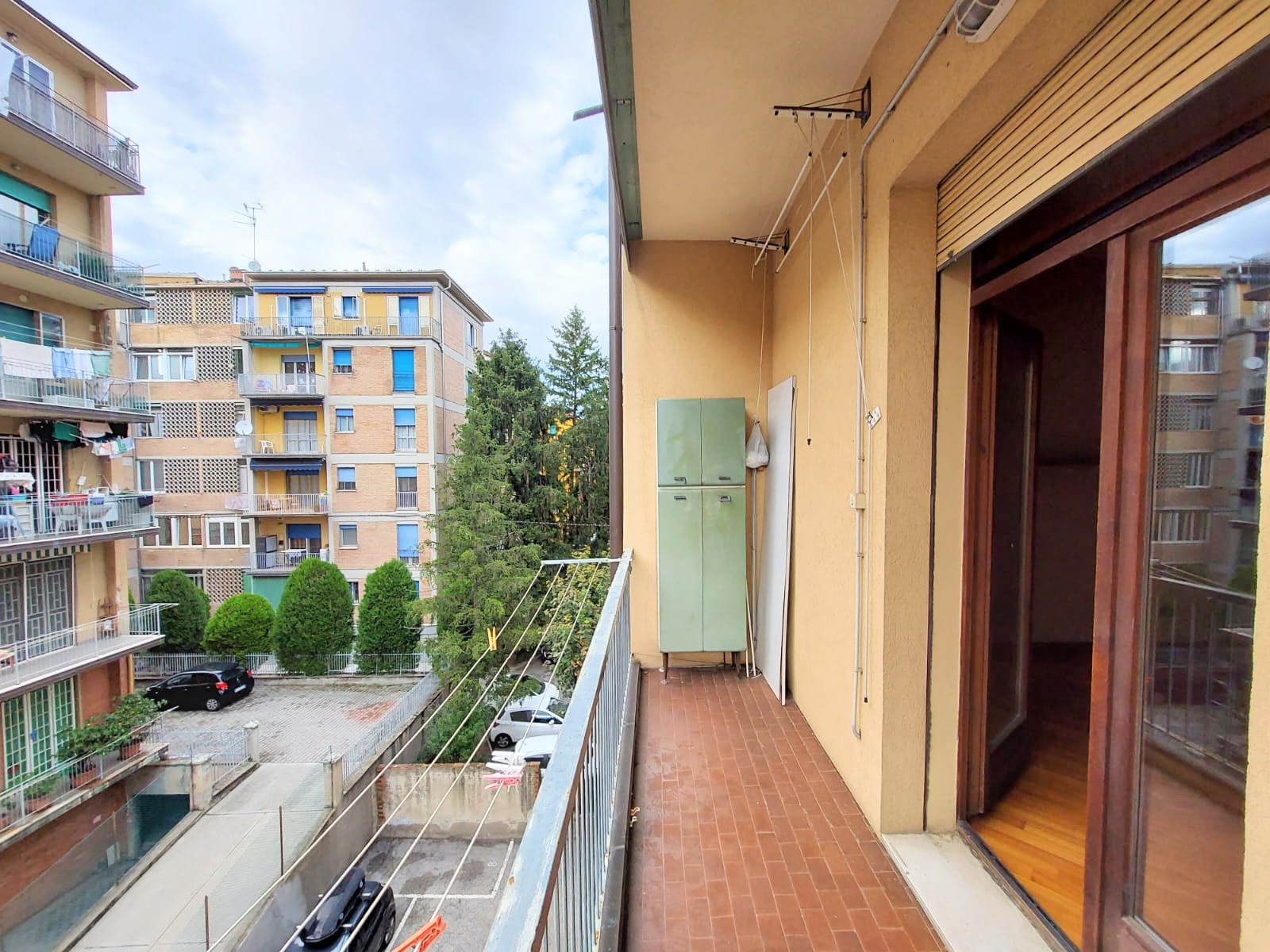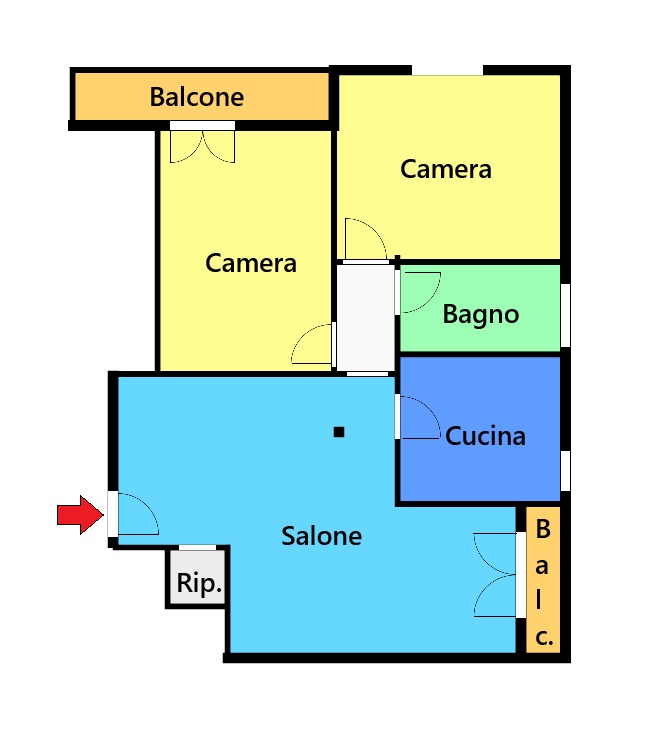 L’immobile è composto da ingresso su ampio salone di circa 30mq che da accesso al balcone pertinenziale, cucina abitabile, ripostiglio, due camere da letto matrimoniali delle quali una con balcone e bagno finestrato.