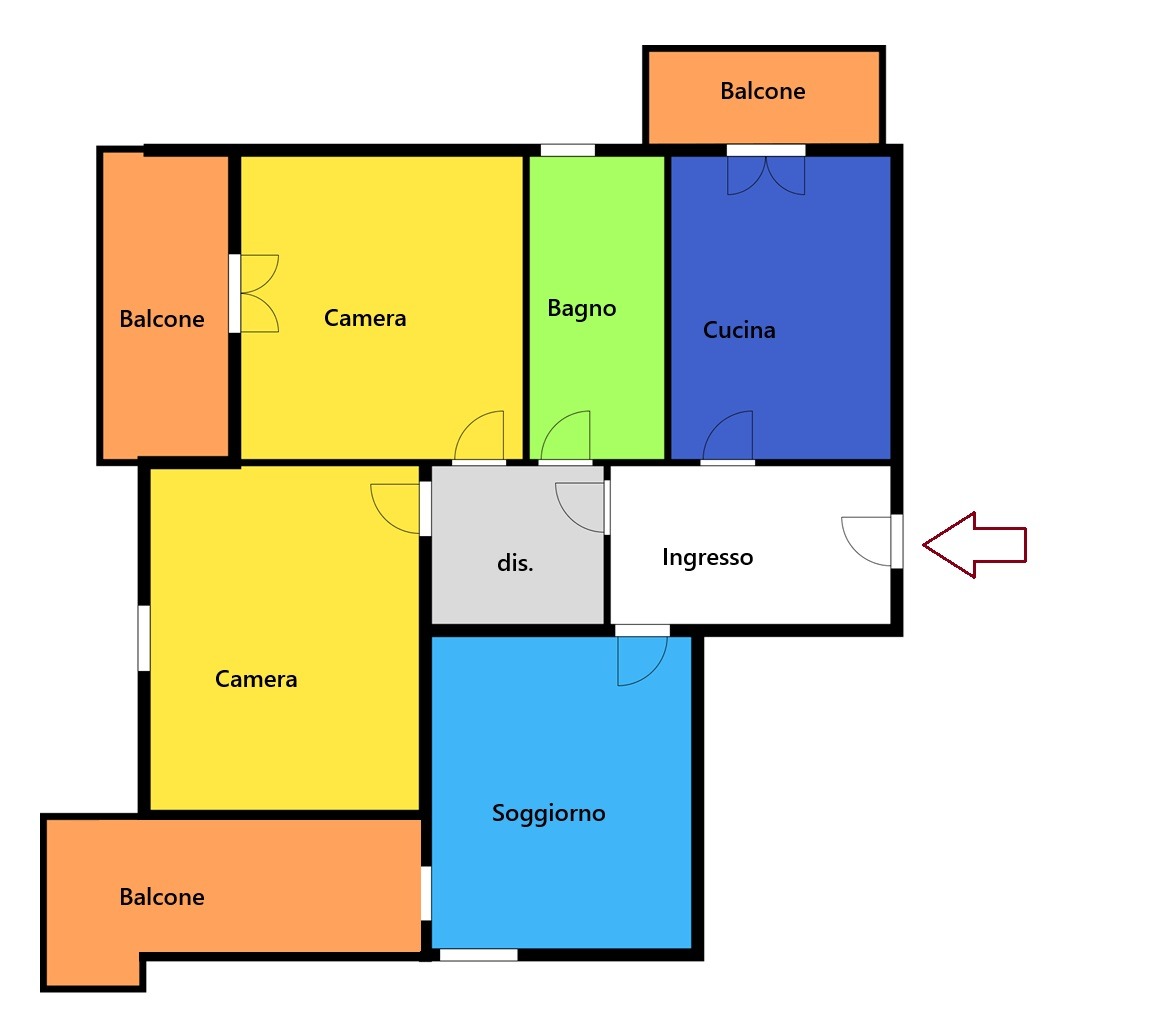 L’immobile è cosi composto: Ingresso di cc. 6,93 mq , cucina abitabile con balcone, soggiorno luminoso con ampio balcone, disimpegno notte.,1 bagno con doccia di cc. 7,00 mq, 1 camera matrimoniale di cc. 16,00 con balcone, 1 camera matrimoniale di cc. 16 mq.