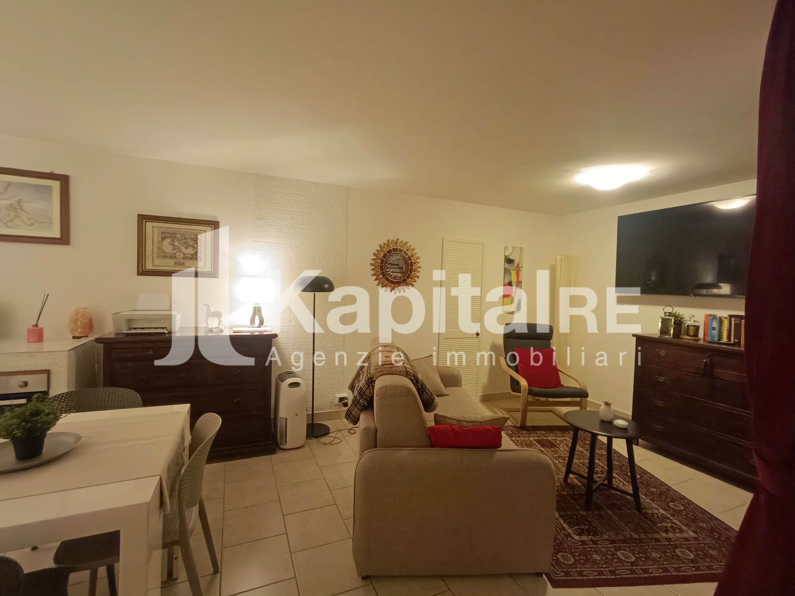 Al piano terra con ingresso indipendente dal giardino, ampia sala di 35 mq con cucina a vista e bagno.
