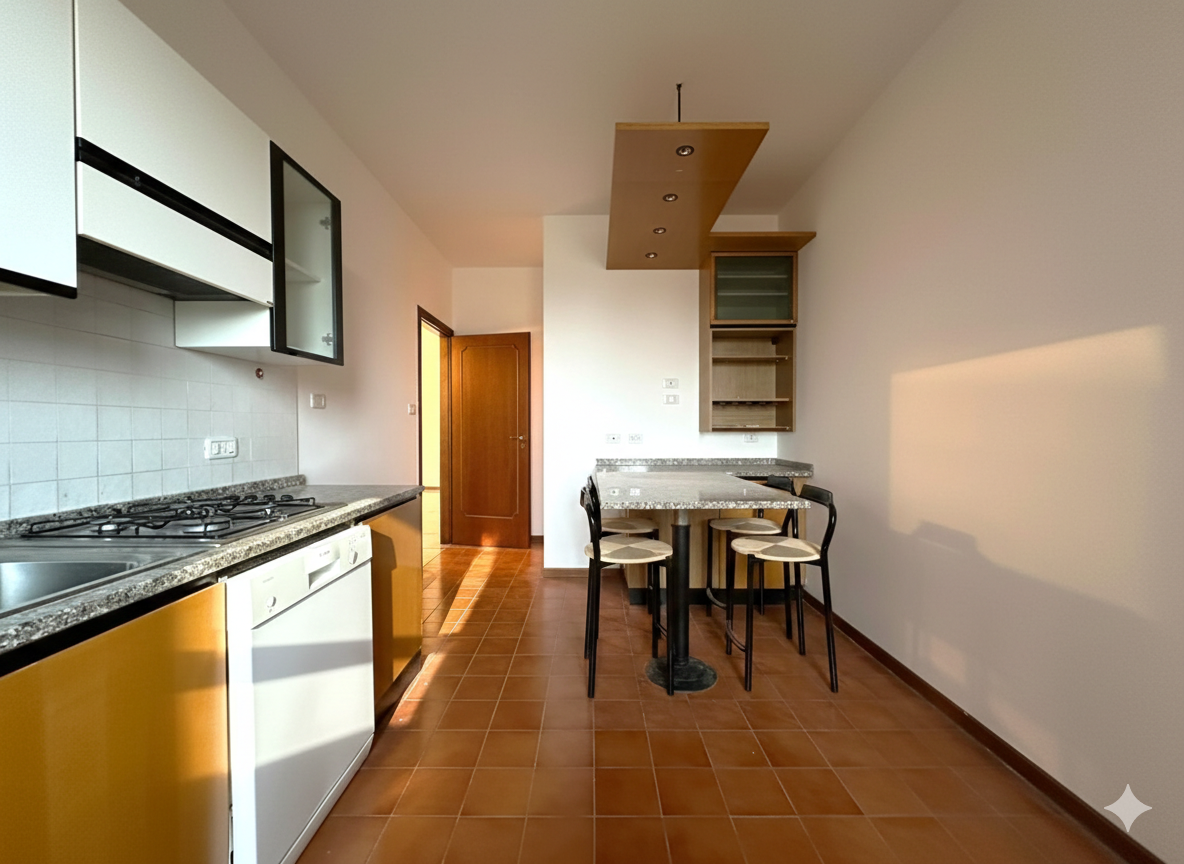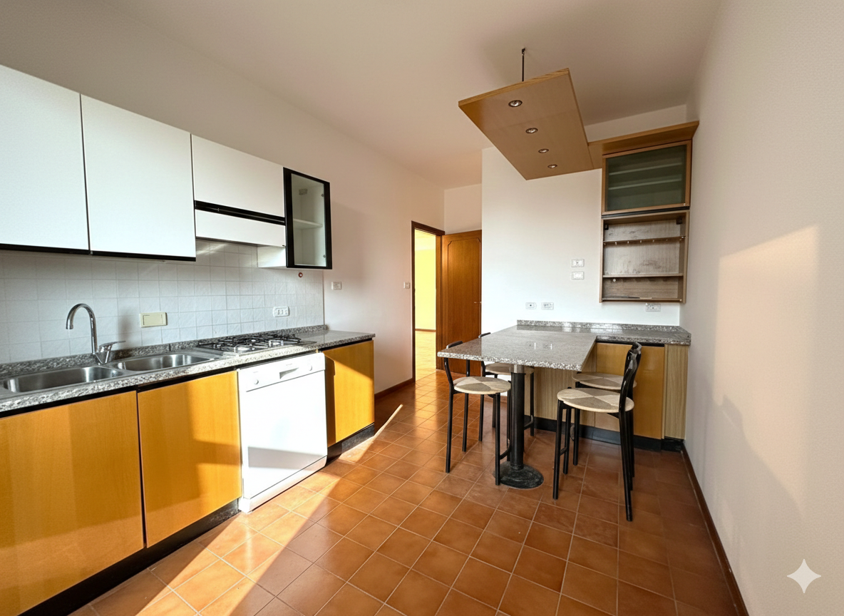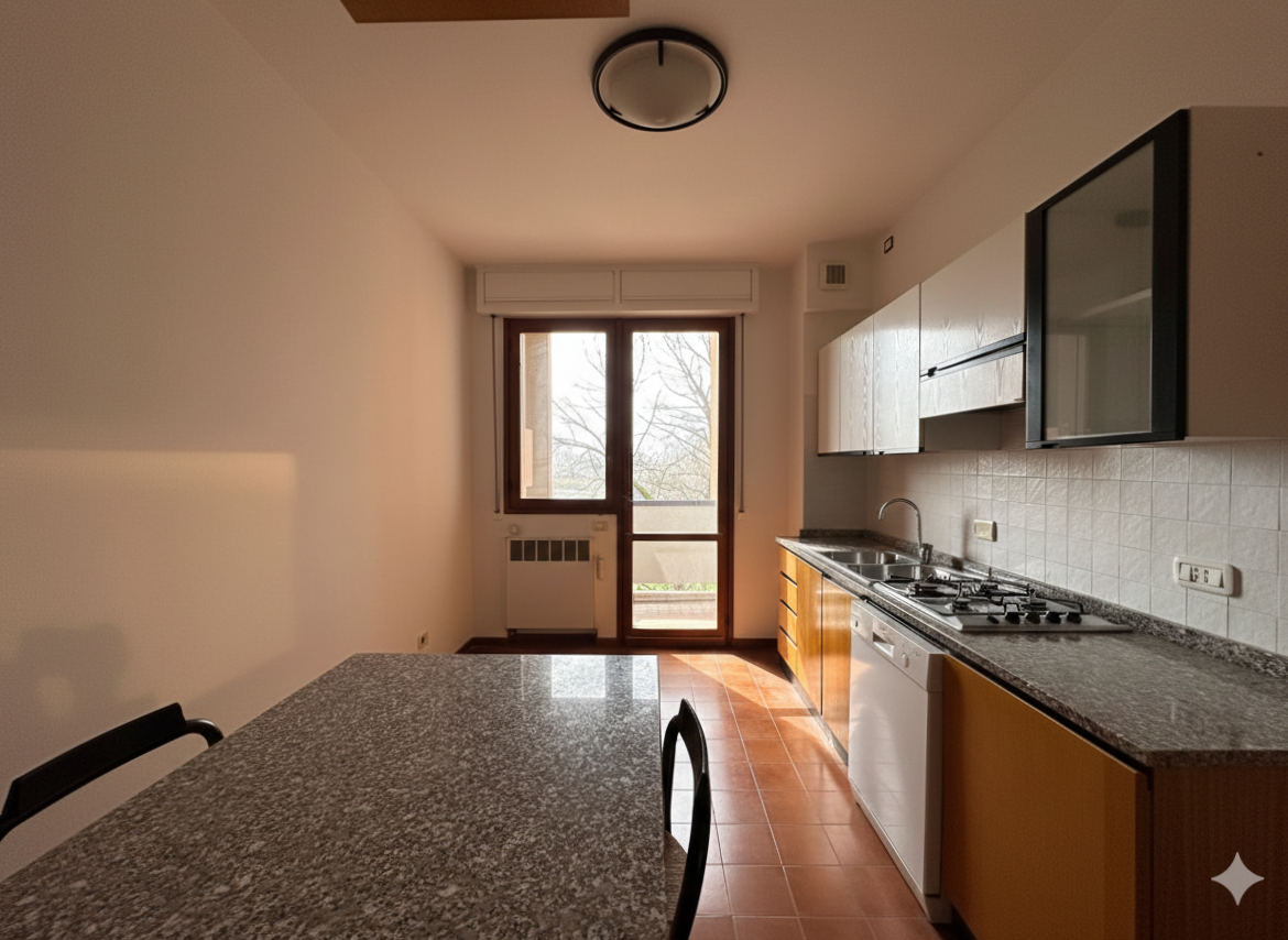 Una cucina abitabile, pratica e funzionale, anch’essa con un comodo balcone, un ripostiglio e due bagni finestrati di cui uno con vasca e l’altro con doccia
