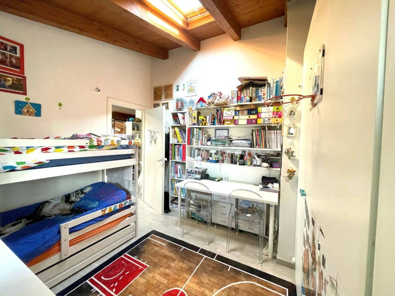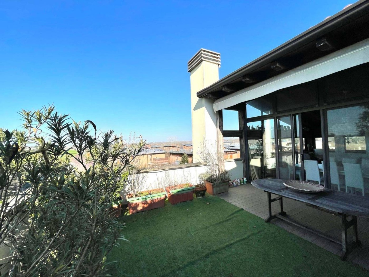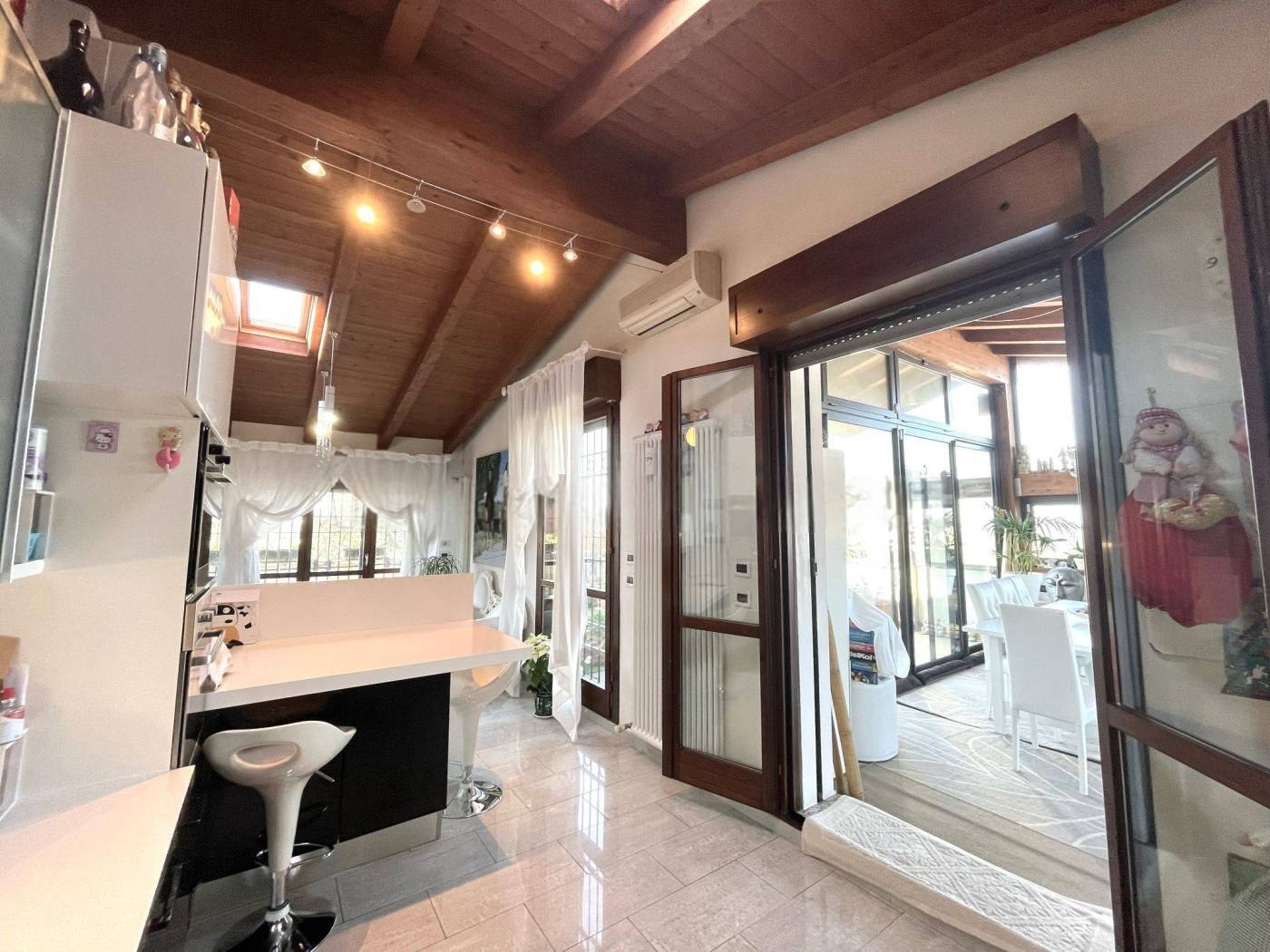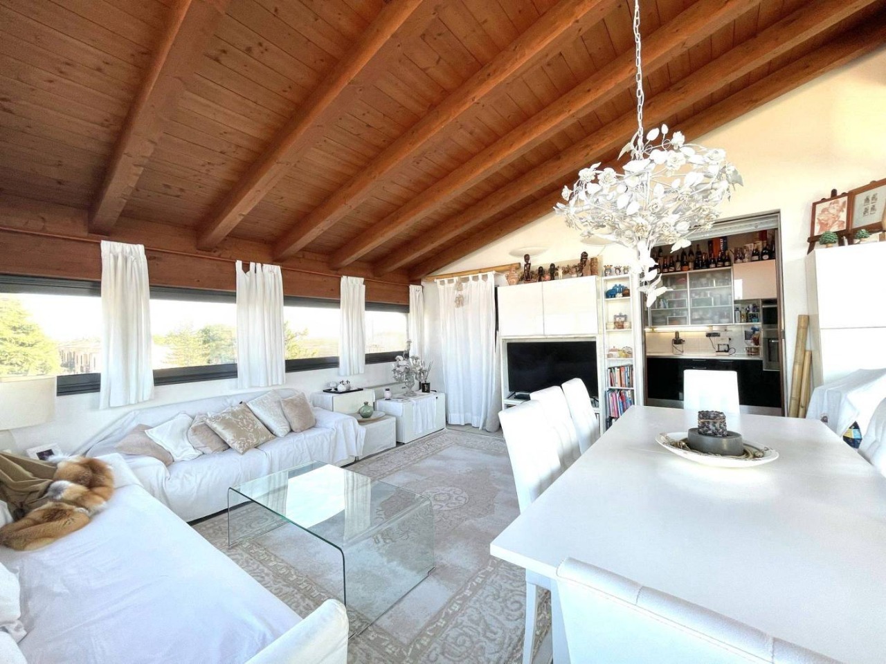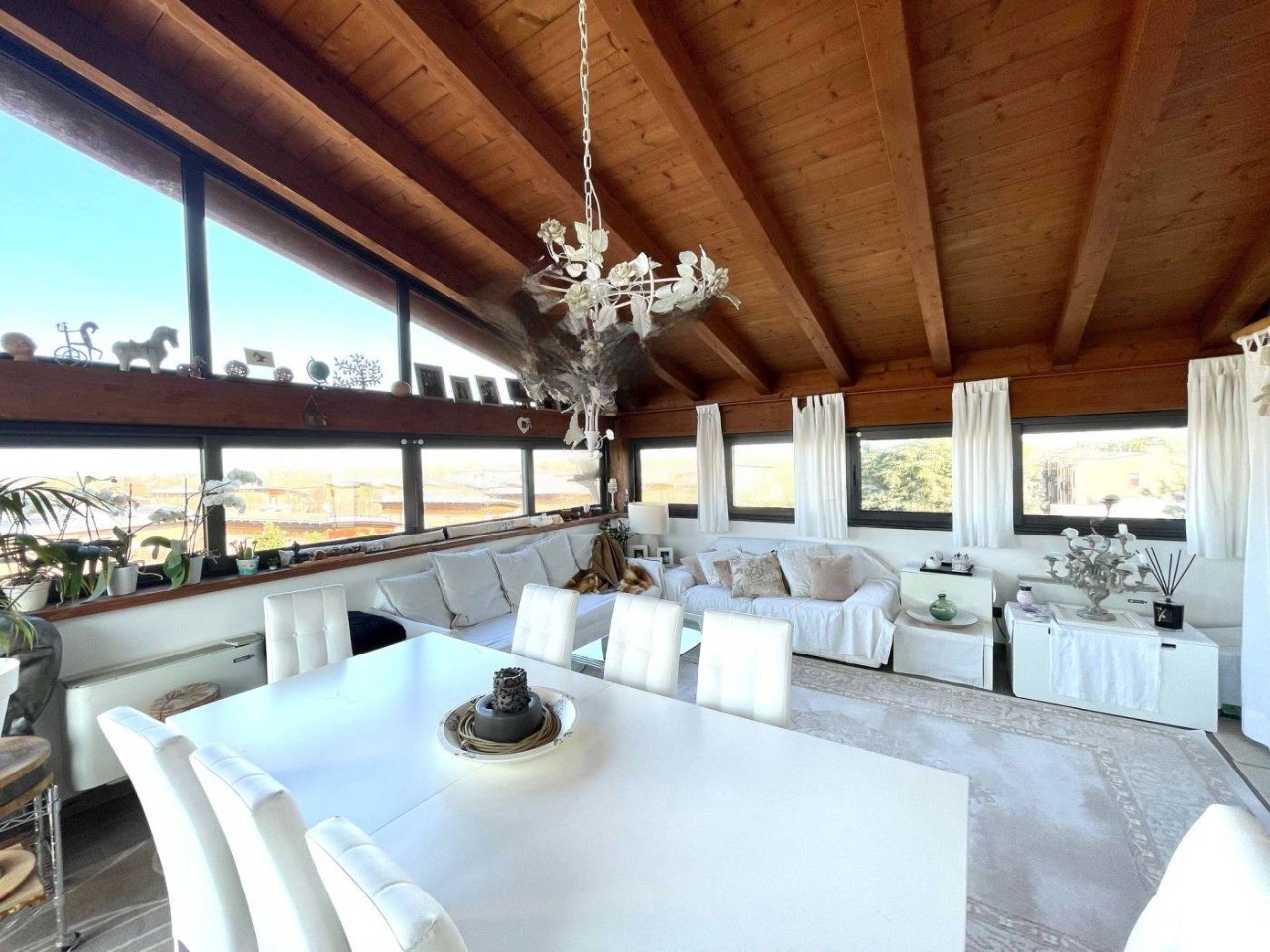 L’immobile, servito da ascensore con accesso diretto all’abitazione, accoglie con una zona giorno di circa 60 mq, travi a vista e alti soffitti mansardati (fino a 3,6 m), da cui si accede a una splendida terrazza abitabile di 50 mq affacciata sul verde circostante. La distribuzione interna comprende 3 camere da letto, 2 bagni finestrati con sanitari sospesi ,uno con vasca e uno box doccia, veranda, ripostigli e disimpegno con armadiature a muro.