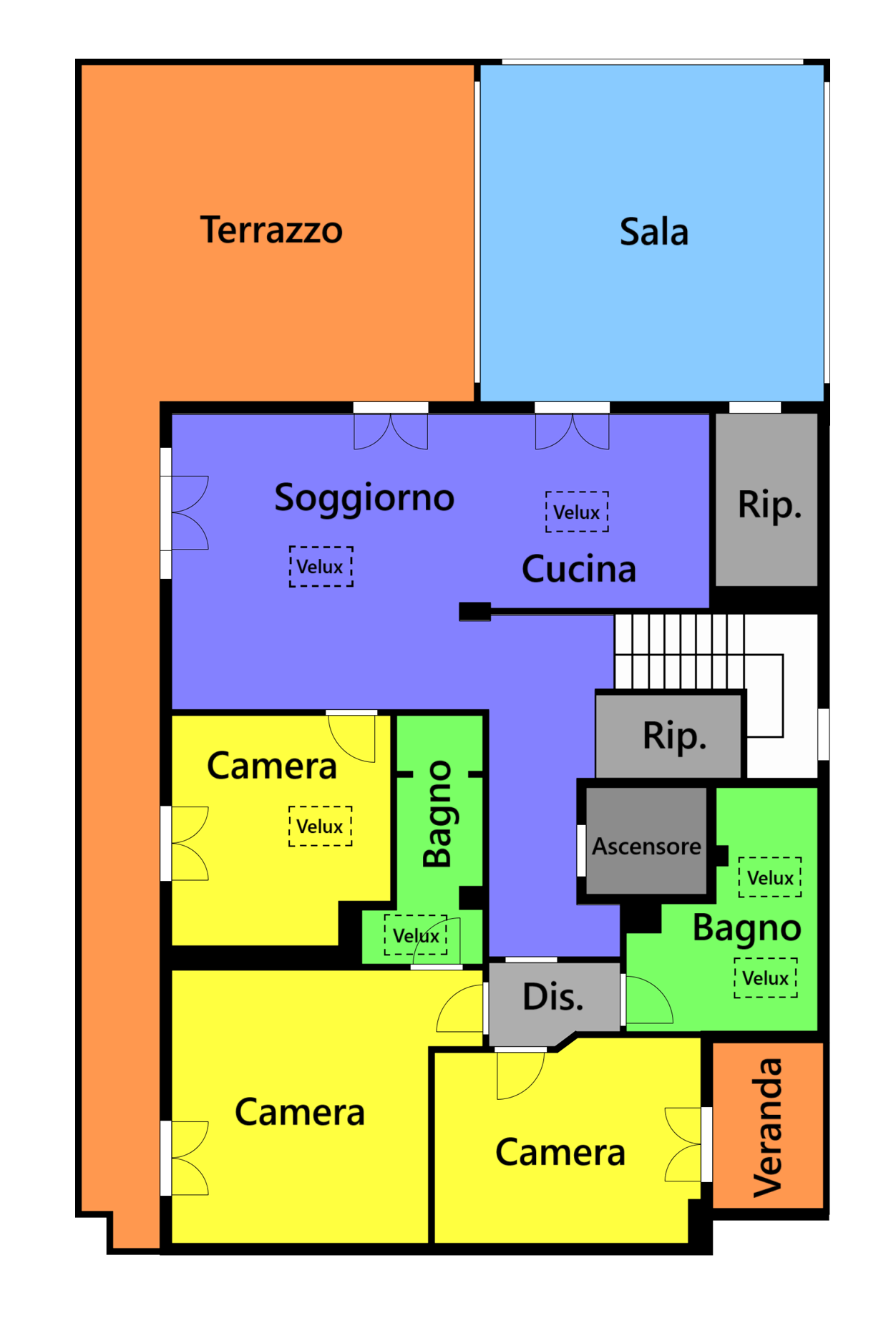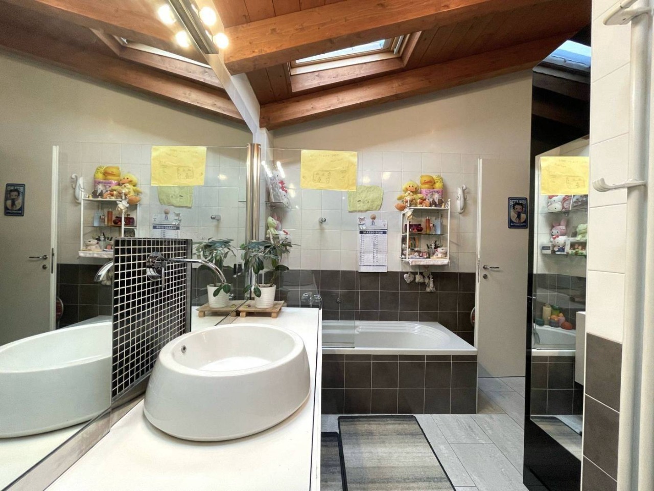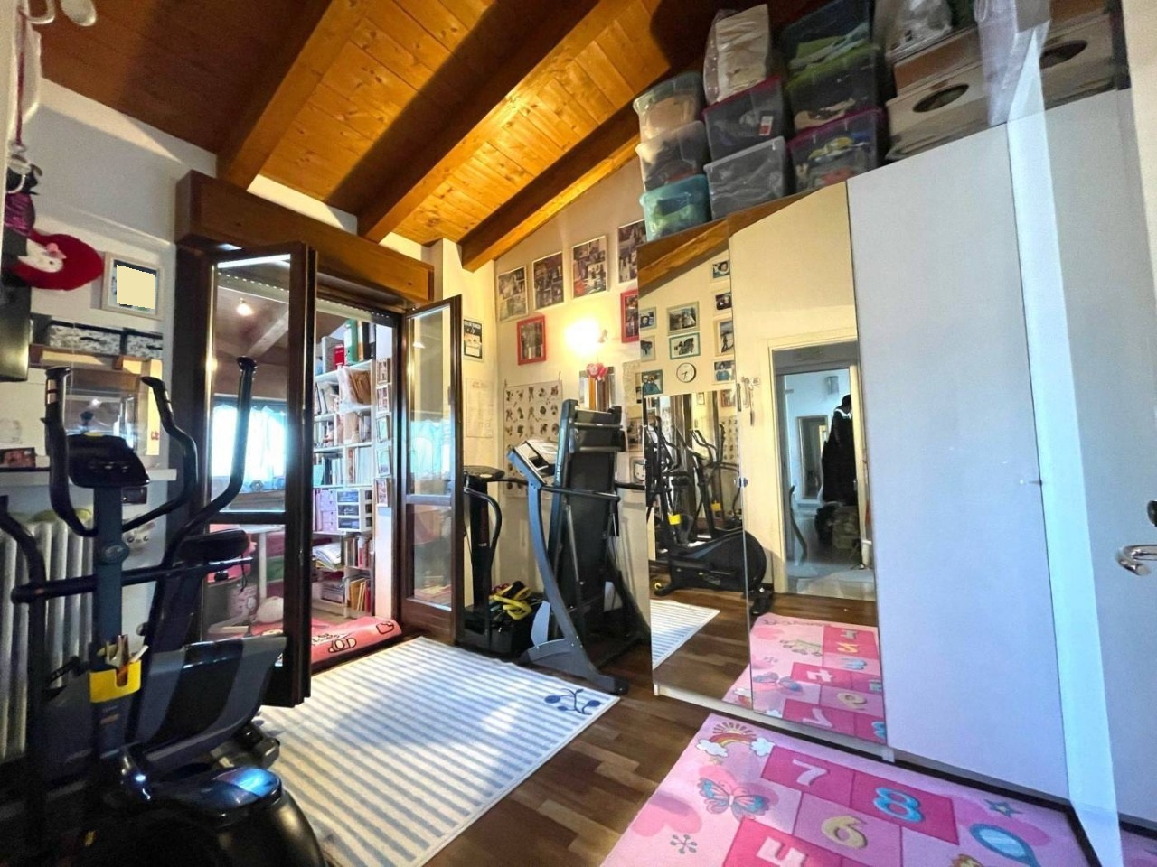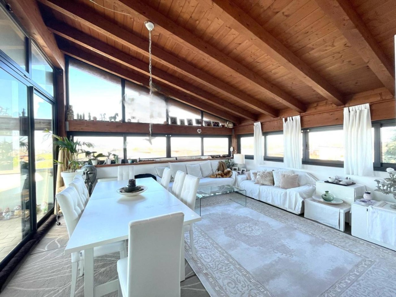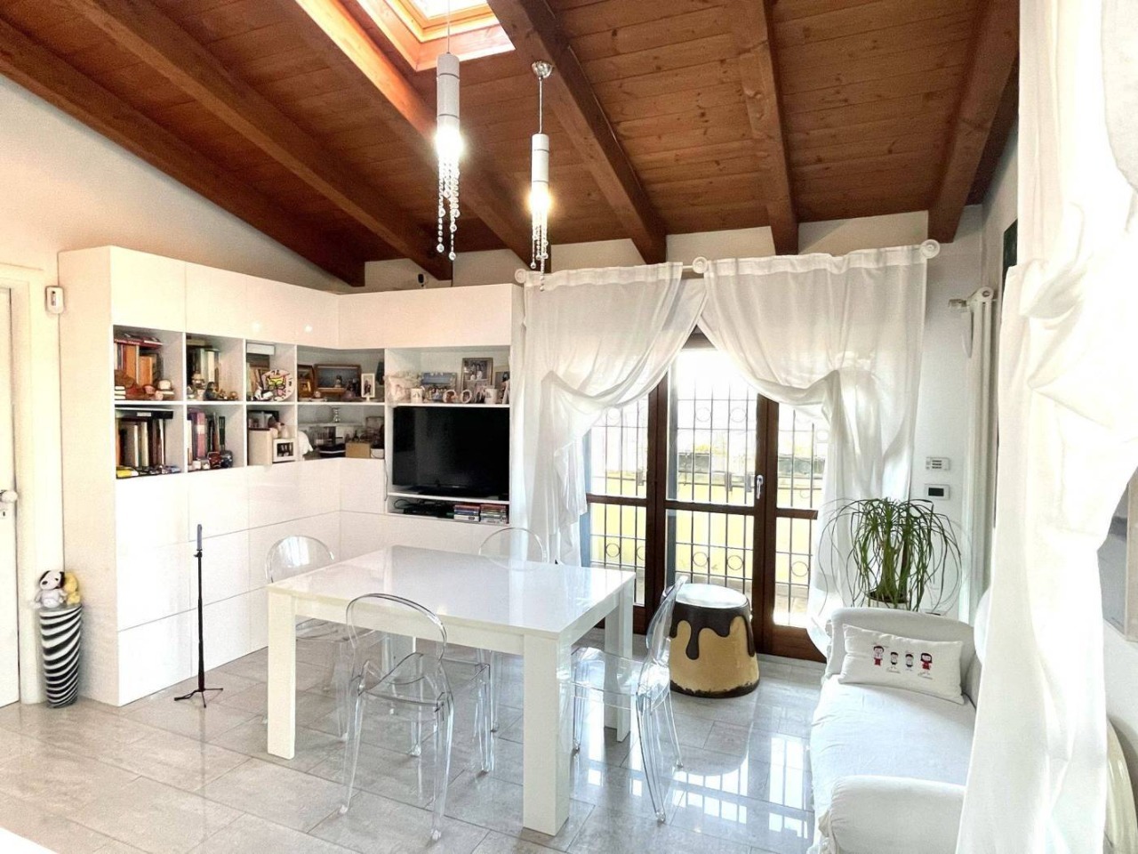 L’immobile, servito da ascensore con accesso diretto all’abitazione, accoglie con una zona giorno di circa 60 mq, travi a vista e alti soffitti mansardati (fino a 3,6 m), da cui si accede a una splendida terrazza abitabile di 50 mq affacciata sul verde circostante. La distribuzione interna comprende 3 camere da letto, 2 bagni finestrati con sanitari sospesi ,uno con vasca e uno box doccia, veranda, ripostigli e disimpegno con armadiature a muro.