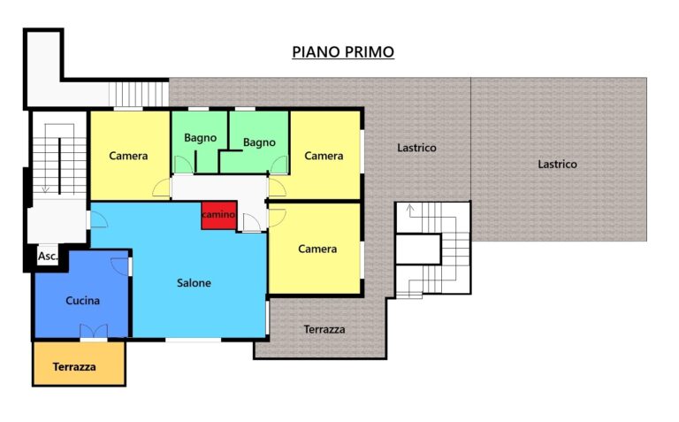 Al primo piano si ha un ingresso su elegante salone con camino, seconda cucina abitabile, 3 camere da letto, 2 bagni e terrazzo panoramico.