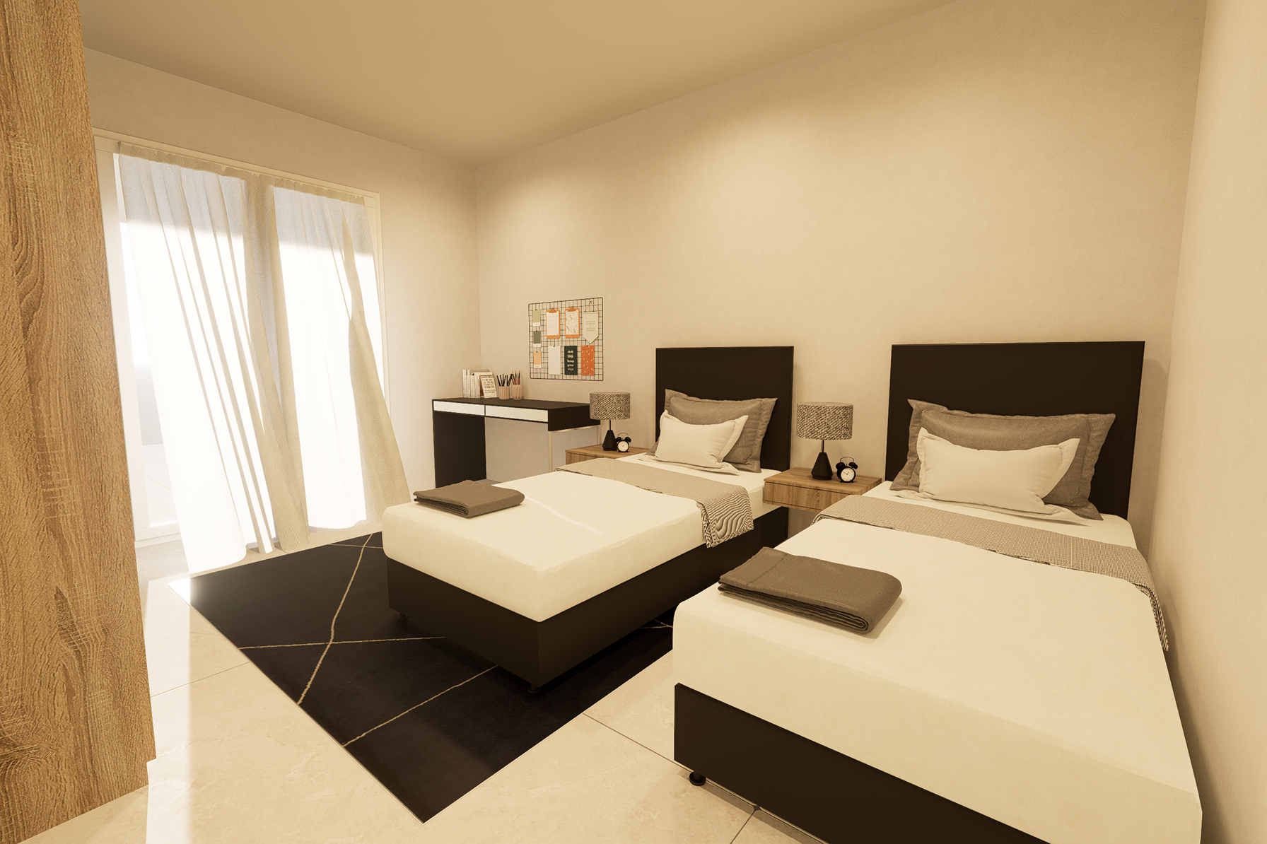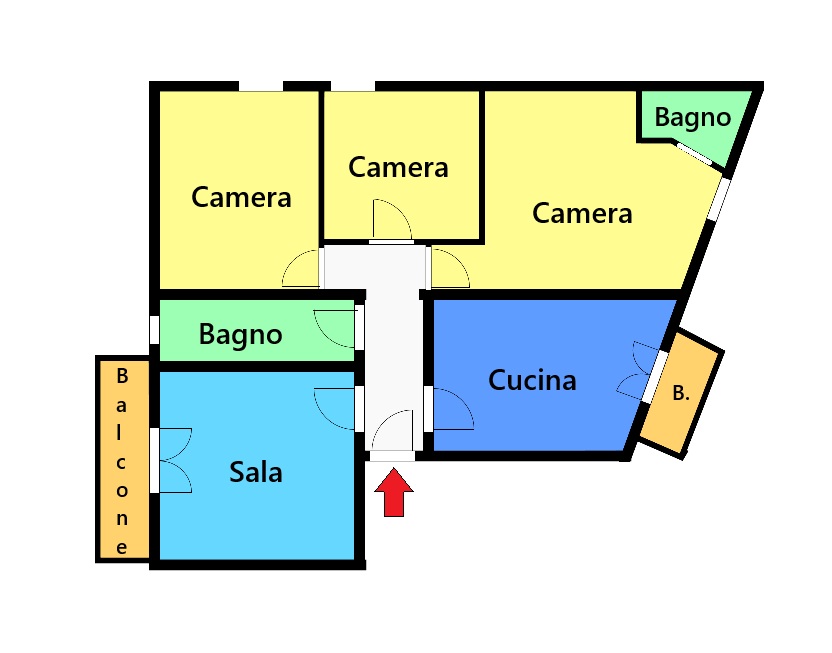 L’abitazione, posta al primo piano, è composta da ingresso su soggiorno con balcone verandato, una cucina abitabile separata servita da un balcone, disimpegno notte, una camera matrimoniale, una camera doppia, una camera singola e due bagni di cui uno non finestrato.