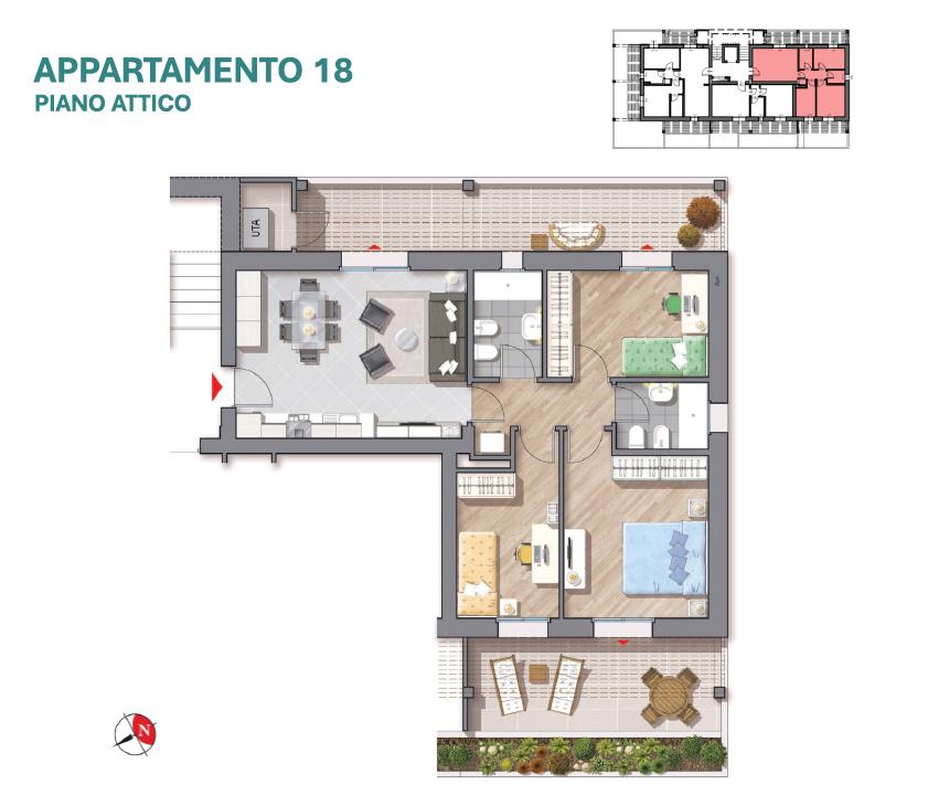 [U.18] Proponiamo splendido Attico. Un appartamento unico per luminosità, grazie alla triplice esposizione ed agli ampi spazi esterni, con terrazzi a servizio sia della zona giorno che della zona notte. Gli spazi interni, ben distribuiti, si compongono di open-space con cucina a vista e terrazzo pertinenziale, tre camere da letto di cui la matrimoniale dotata di ulteriore terrazzo abitabile, doppi servizi finestrati, armadio a muro ad uso lavanderia, comodo locale tecnico che funziona anche da ripostigli.