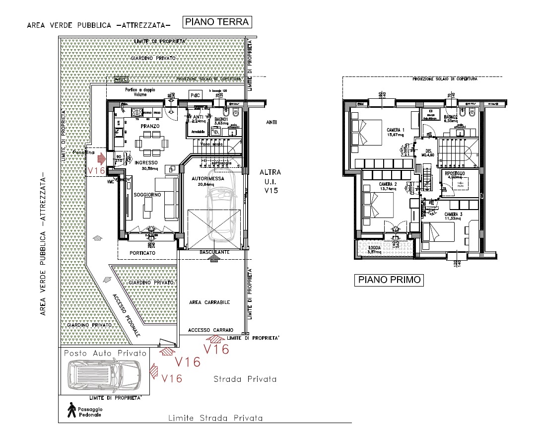 La villa è disposta su 2 livelli con ingresso indipendente su soggiorno con cucina a vista di cc 30 mq, antibagno con zona ripostiglio e bagno finestrato. Al 1° piano, 3 ampie camere da letto,1 ripostiglio con lucernaio, 1 loggia di 4 mq e 1 bagno. L’immobile è completo di autorimessa di 21 mq al piano terra e giardino privato su 3 lati di cc 160 mq con entrata pedonale e carraio sul fonte rifinito da pavimentazione da esterno. (V16). CONSEGNA NOVEMBRE/DICEMBRE 2026
