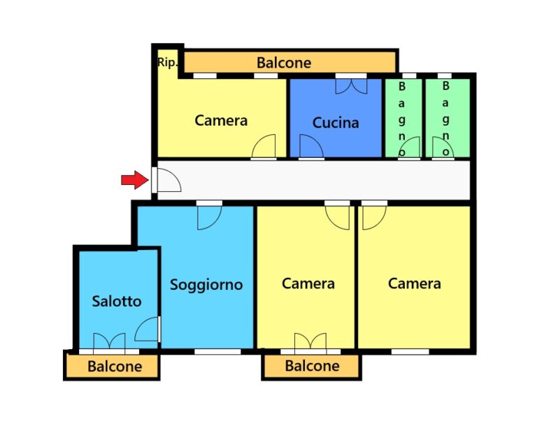 L’abitazione è composta da ingresso che distribuisce un soggiorno, salotto con balcone, cucina abitabile con balcone, tre ampie camere da letto matrimoniali di cui una con balcone, due bagni finestrati. Cantina al piano Interrato.