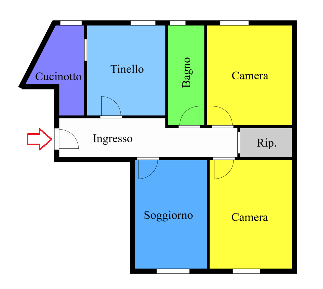 L’immobile, caratterizzato da una superficie funzionale, è distribuito come segue: un corridoio centrale conduce a un cucinotto, un tinello, un soggiorno, due camere da letto, un ripostiglio e un bagno. L’altezza dei vani è di circa 3,00 metri, mentre la cantina al piano interrato ha un’altezza di circa 3,60 metri, offrendo ampi spazi di stoccaggio.