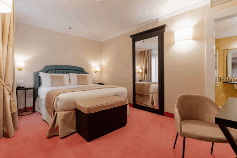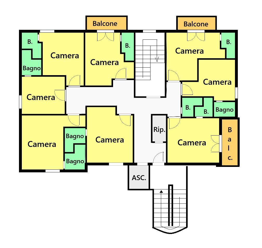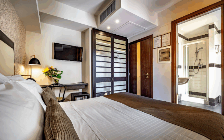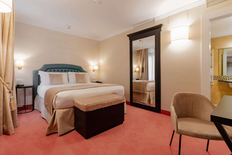 Sui tre piani superiori, l’hotel offre camere ampie e luminose, tutte con bagno privato, alcune impreziosite da balconi panoramici. Gli ambienti accoglienti, sono perfettamente organizzati per garantire privacy e comodità agli ospiti. I locali di servizio sono al piano terra ed al terzo. Presente un’ascensore interno che collega comodamente tutti i livelli.